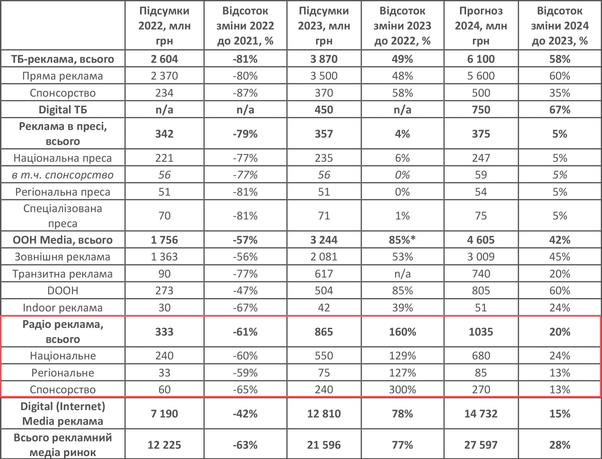 За даними Всеукраїнської Рекламної Коаліції, найбільше зростання інвестицій в рекламу в 2023 році по відношенню до 2022 року – 160% – показало саме радіо.