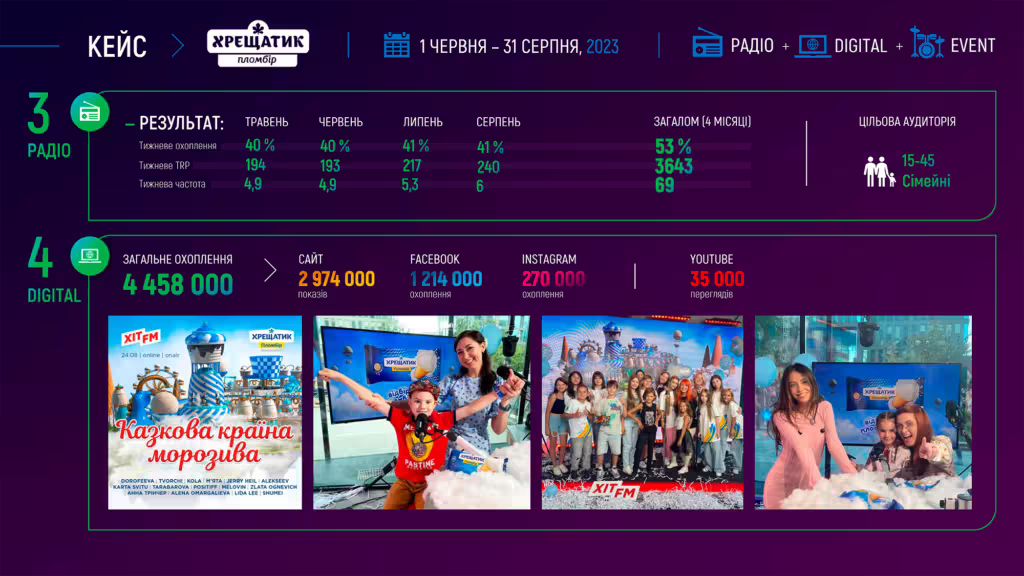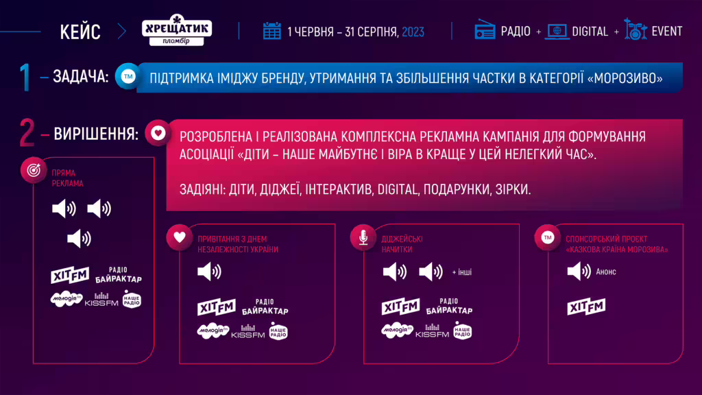 Ми створили спеціальний проект “Маленькі українці – великим героям” у форматі нативної інтеграції на радіо. Щодня в ефірі діти ділились своїми малюнками та словами підтримки для наших захисників, підкріплюючи любов до морозива Хрещатик як символу щасливого дитинства.