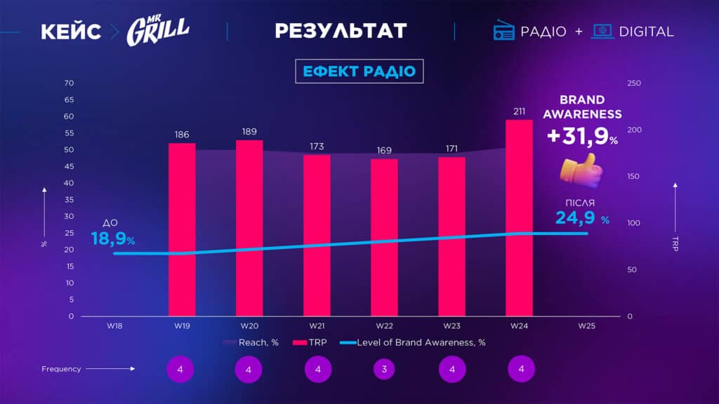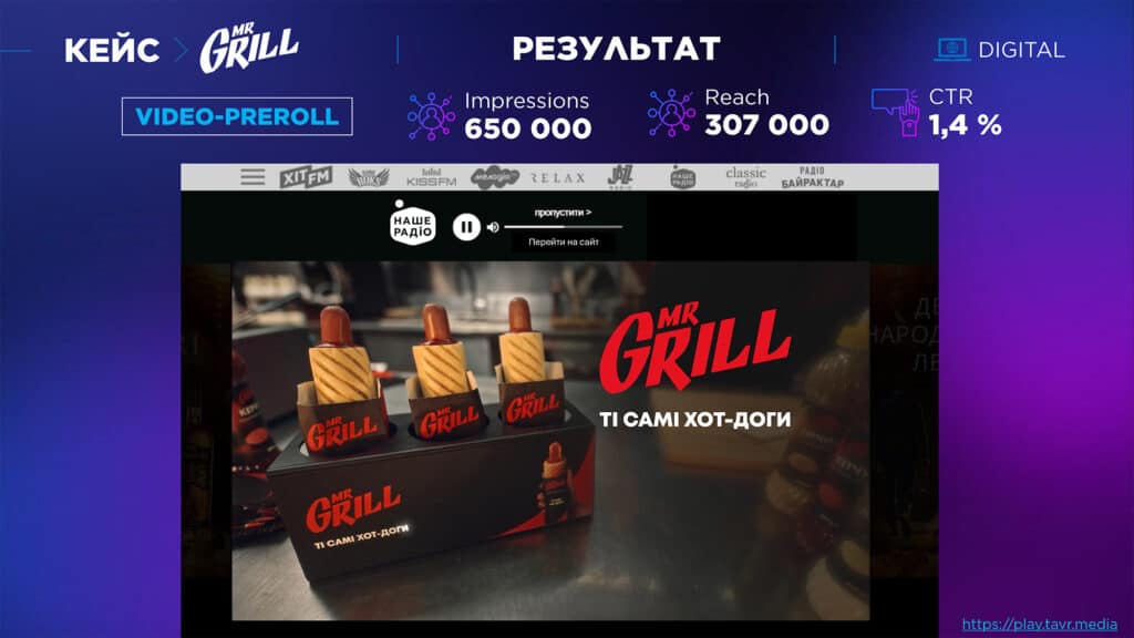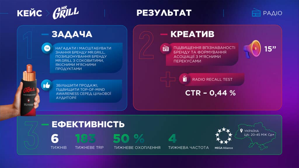 Визначити ефективність аудіо креативу нової комунікації Mr.Grill перед стартом рекламної кампанії на радіо за допомогою Radio Recall Test – ексклюзивного інструменту TAVR Media.