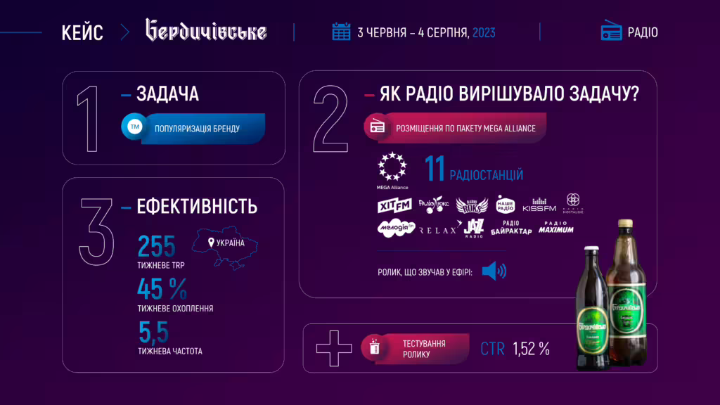 Наш влучний креатив забезпечив суттєве охоплення серед слухачів. Понад півтора мільйони чоловіків 25-45 років почули рекламу пива Бердичівське.