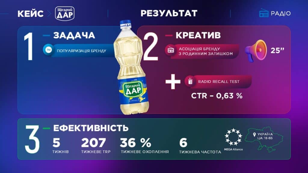 В результаті Radio Recall Test на цільову аудиторію «вік 18-54, хобі: кулінарія» був досягнутий CTR 0,63. Ролик не лише потрапив до етеру, але й став звуковою доріжкою до відео, створеного за допомогою ШІ.