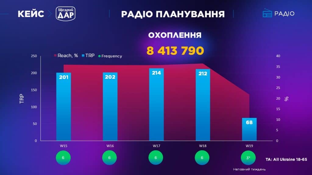 Для FM-етеру було обрано рекламний пакет Mega Alliance Full, який включає пряму рекламу на 11 радіостанціях столиці. В результаті охоплення рекламної кампанії склало 8,4 млн людей в етері та 6 млн в digital.