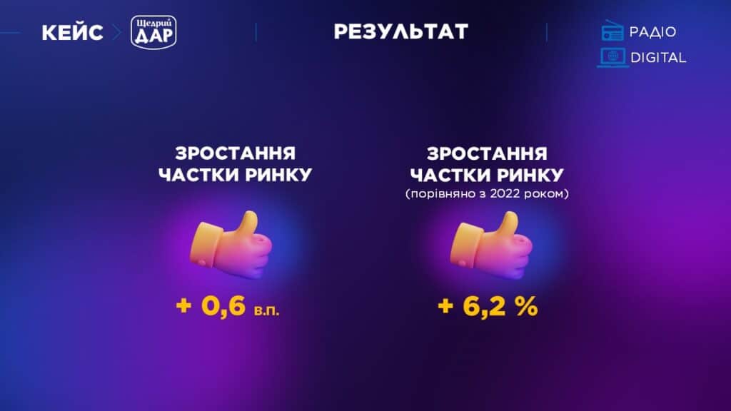 За період рекламної кампанії частка ринку зросла на 0,6 відсоткових пунктів ( 5 тижнів). Якщо порівнювати з 2022 роком – приріст долі ринку відбувся на 6.2%.