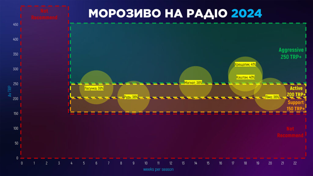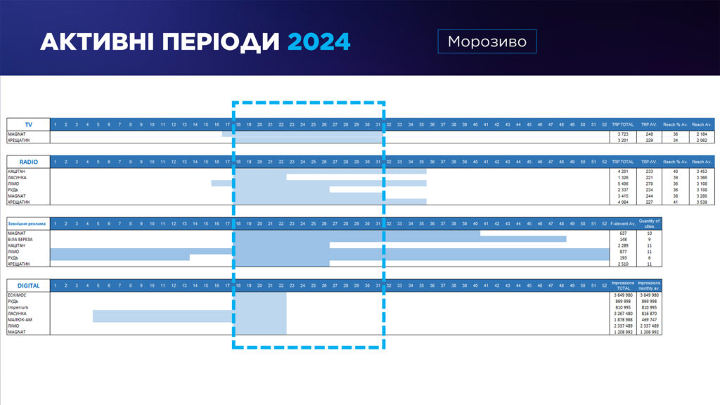 Таким чином можемо зазначити, що в 2024-му році сезон морозива тривав 15 тижнів, розпочався з 18-го тижня і завершився для основних гравців на 32-му тижні. Найбільш активно використовували медіа мікс RADIO + OOH, що доволі логічно для теплої пори року.