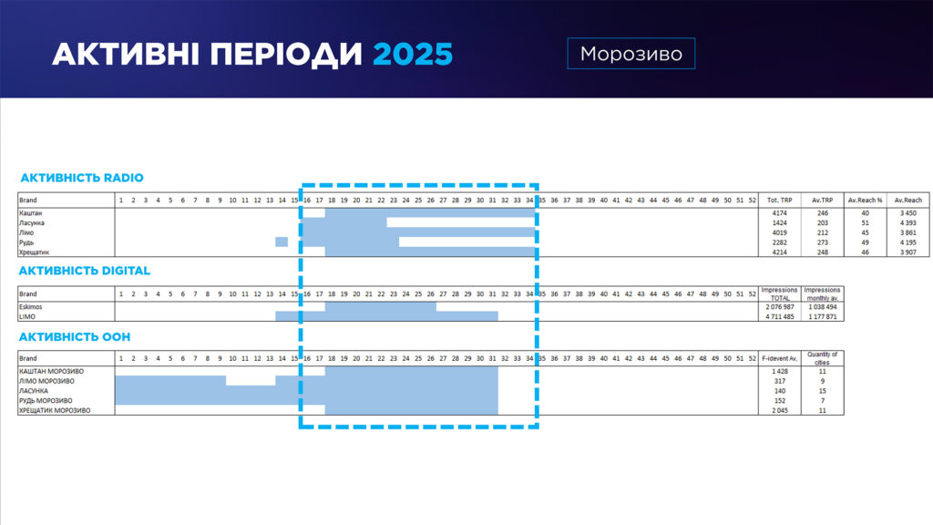 Подовження періоду рекламної активності на РАДІО на 4 тижні з 15 тижнів у 2024-му році до 19 тижнів у 2025-му, а також скорочення присутності на ТБ у 2025-му році.